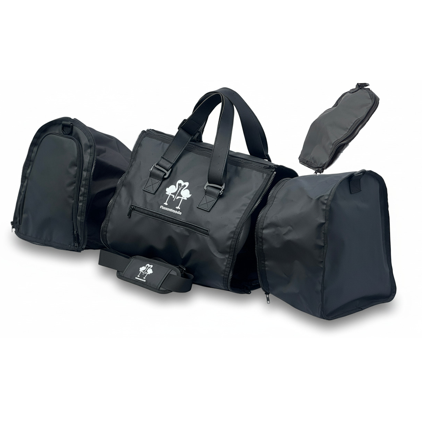 Chaque Side contient une poche (interne, externe, chaussures ou ordi/tablette). La Base inclut 4 grips pour maintenir le sac au-dessus du sol et 4 œillets étanches pour une isolation totale.